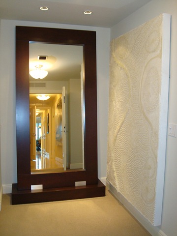 An oversize mirror anchors the end of the hallway with one of Andrea Marcus' paintings providing nice contrast to the dark wood.
