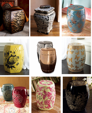 Row 1: Tiger garden seat, $195, Black/white hand painted porcelain, $199, Blue hand crafted porcelain, $195